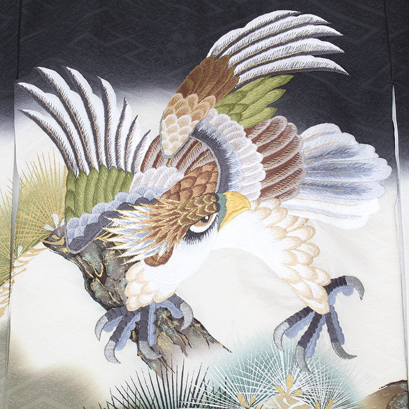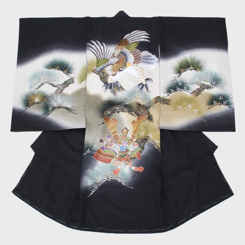 鷹は出世・大成を願う柄・兜は邪気、厄から子供を守り、健やかな成長と将来の繁栄を願う縁起の良い図柄です。松は長寿・威厳・子孫繁栄などの意味がございます。
