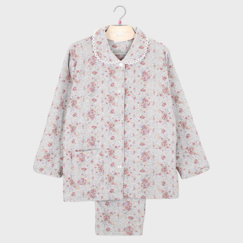 婦人シャギー衿付き前開きパジャマ(花ストライプ)