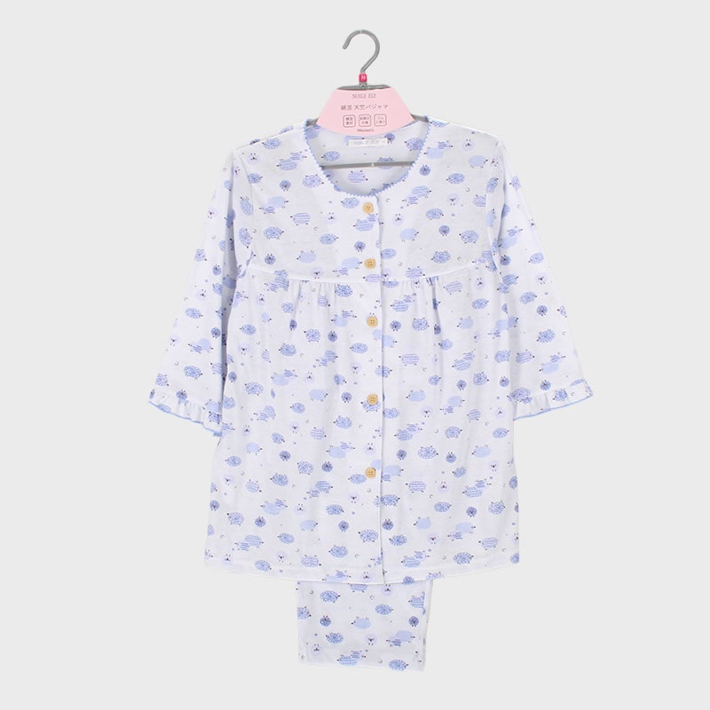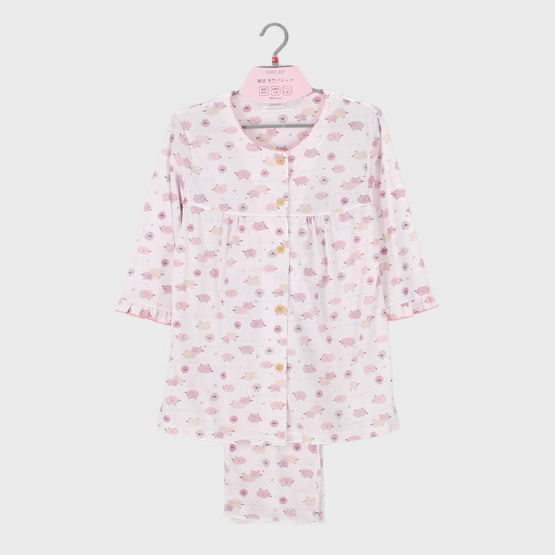 婦人『NOBLE ELE』綿混天竺衿無し胸切り替え7分袖パジャマ(ひつじ)