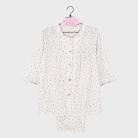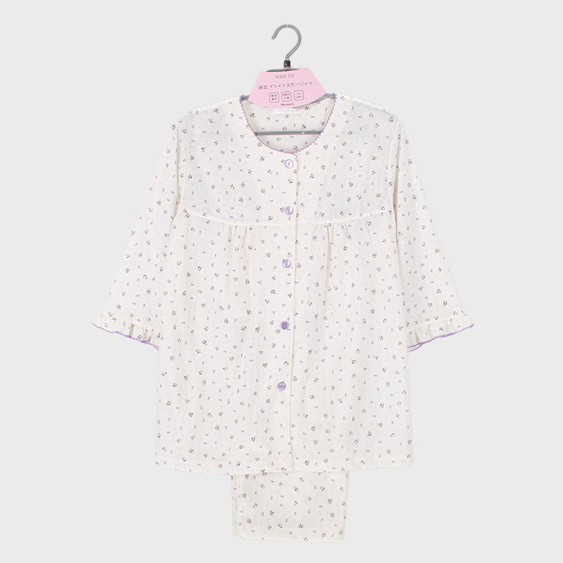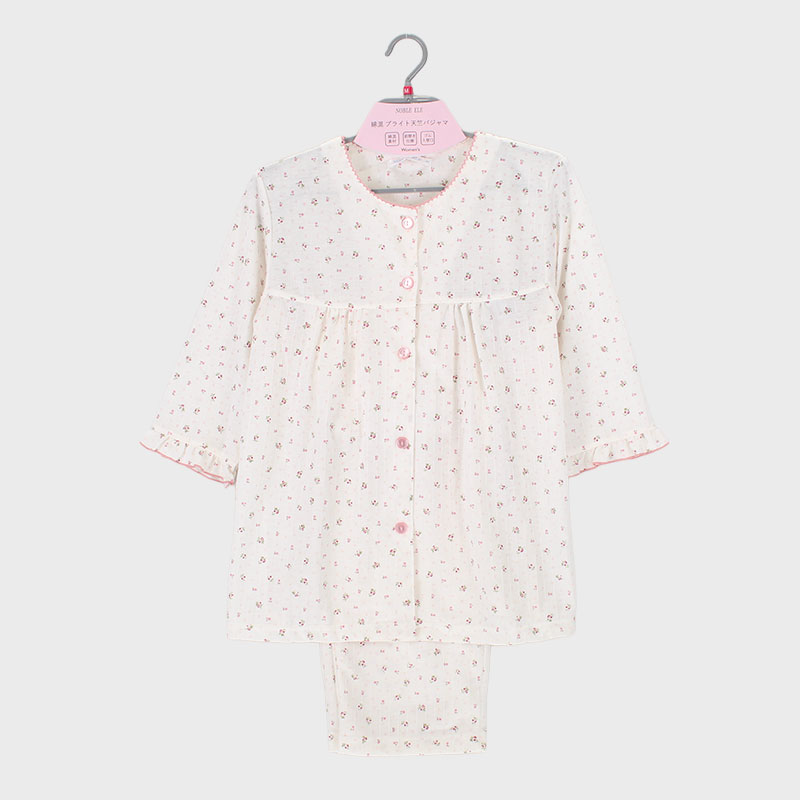 婦人『NOBLE ELE』綿混ブライトストライプ天竺衿無し7分袖パジャマ(小花)