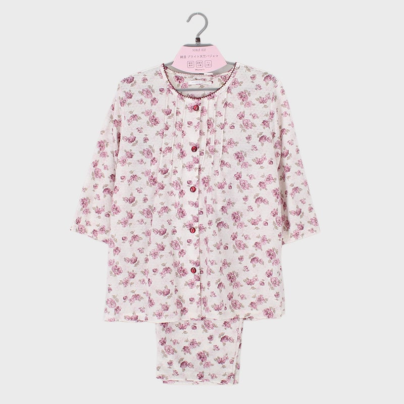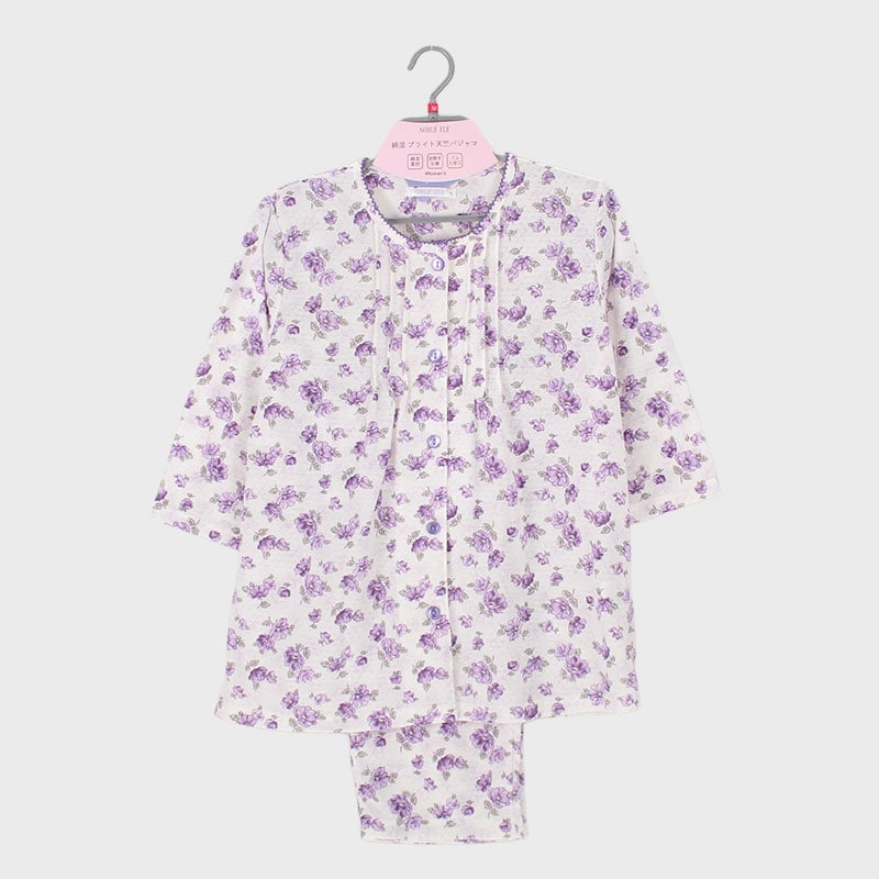 婦人『NOBLE ELE』綿混ブライトドット天竺衿無し7分袖パジャマ(中花)