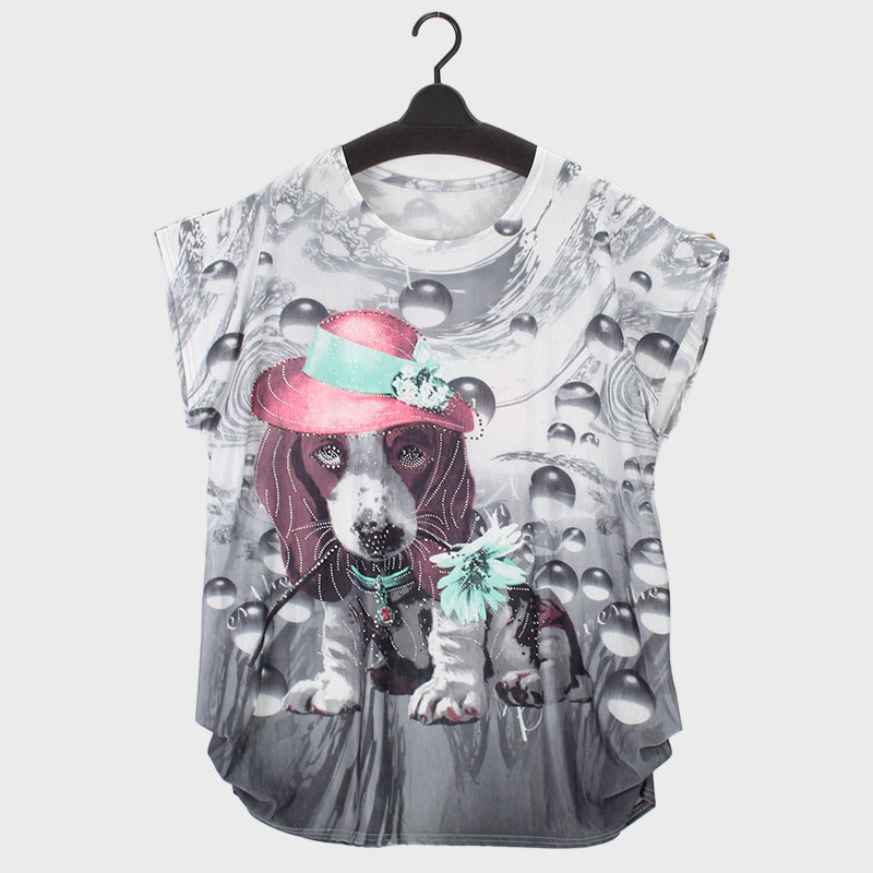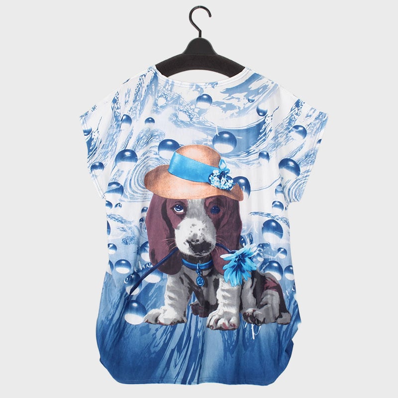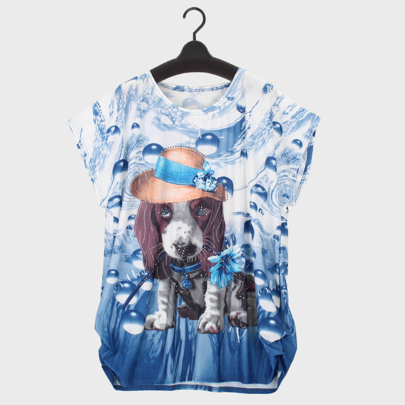 大西衣料(株)が運営する、【公式】卸・仕入れサイト『SELF WEB SHOP』で 婦人プリントキラキラチュニック(犬) をお仕入れ!