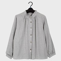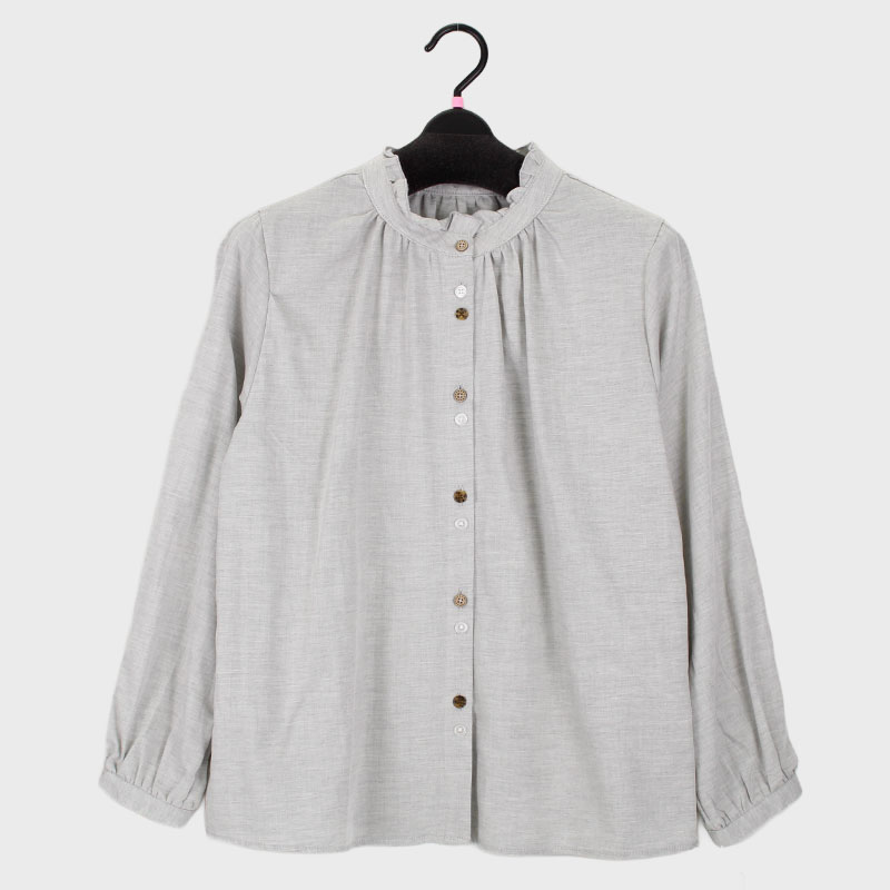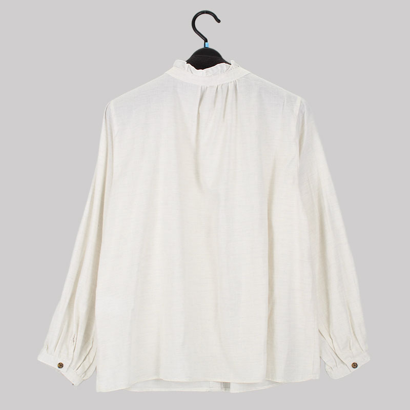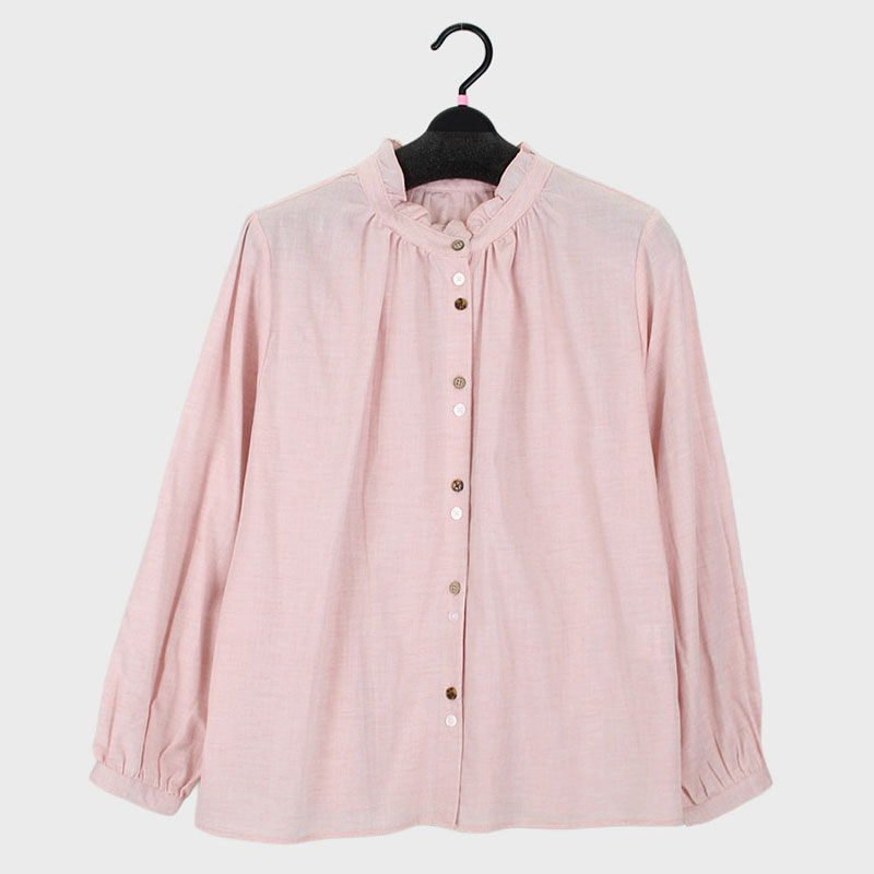 婦人綿100%多釦衿フリル付無地ブラウス