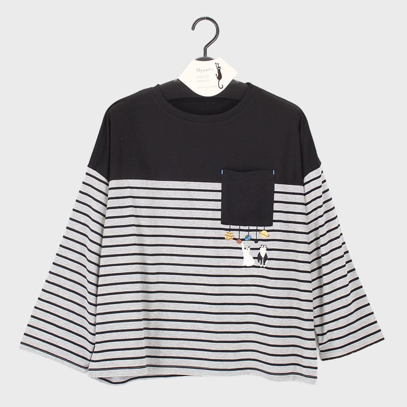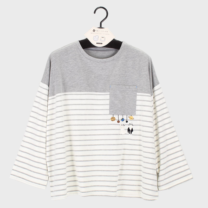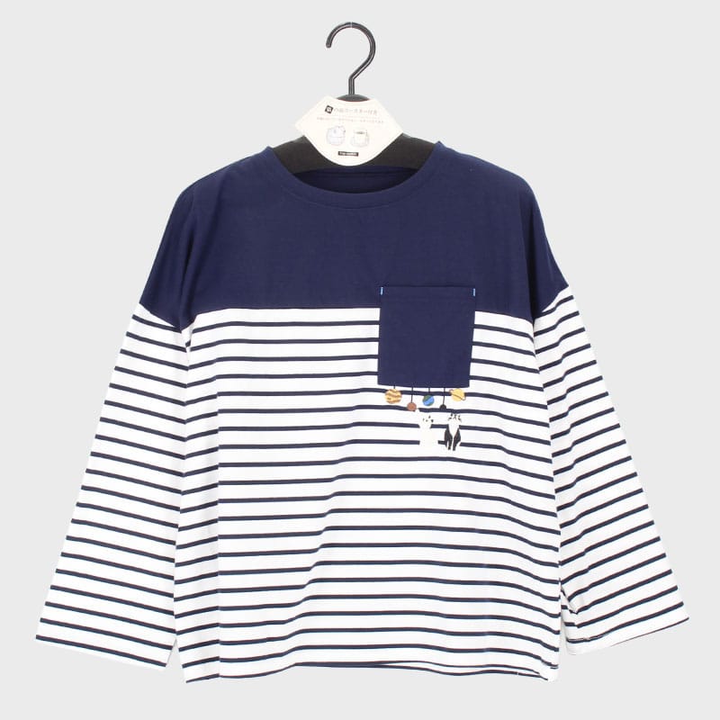 婦人長袖ボーダーネコ刺しゅうTシャツ