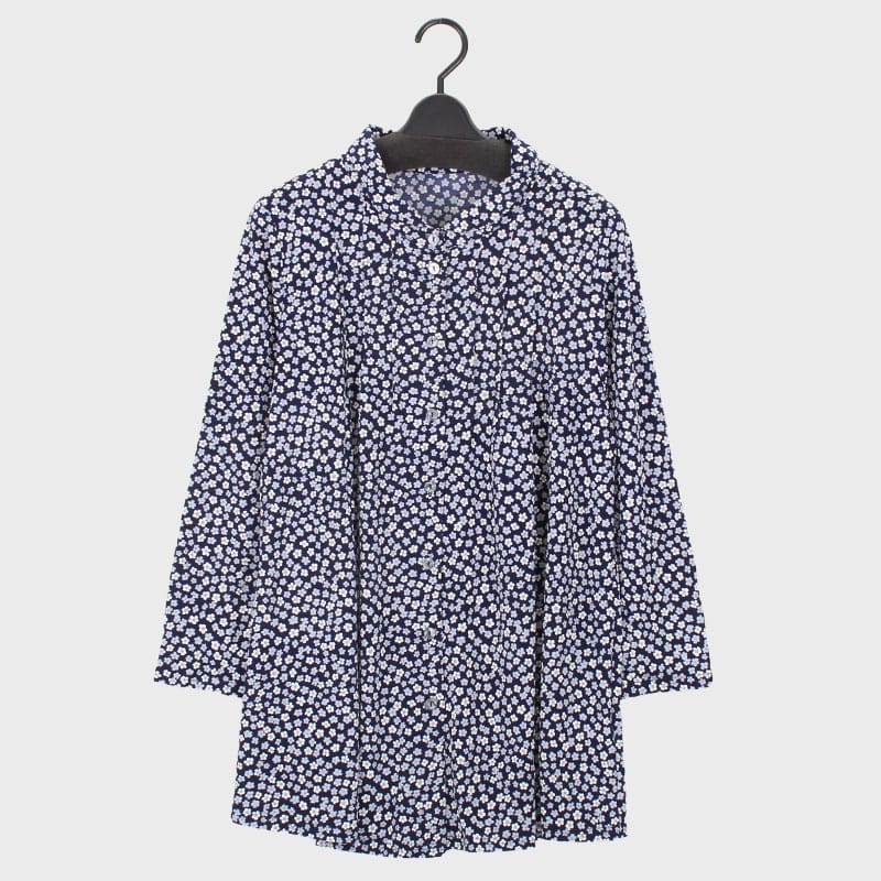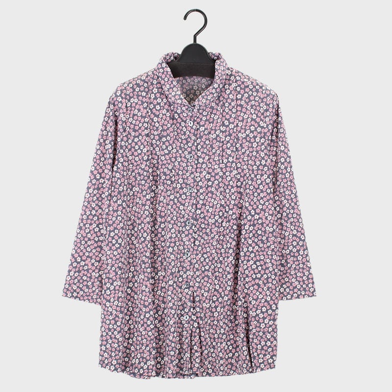 婦人長袖プリント全開襟付きピンタックチュニック