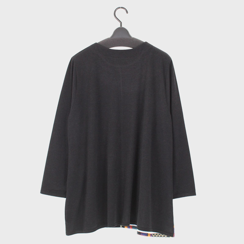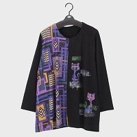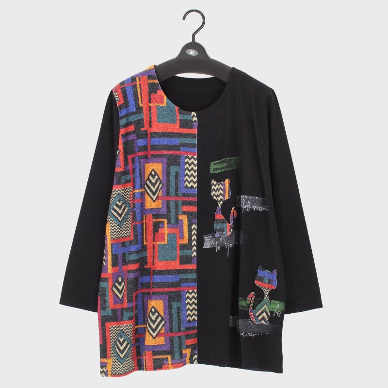 婦人長袖大寸ネコ×幾何学切替チュニック