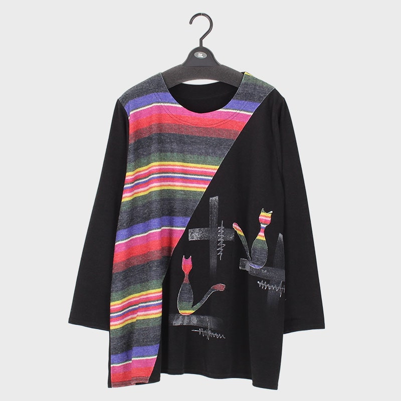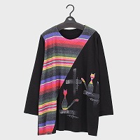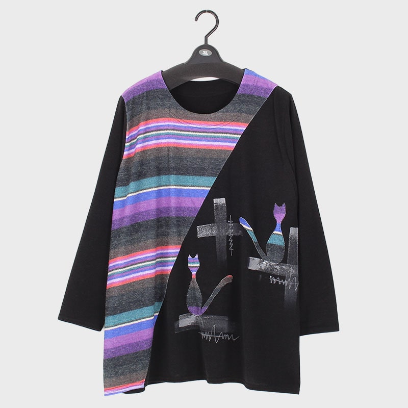 婦人長袖大寸ネコ×ボーダー切替チュニック