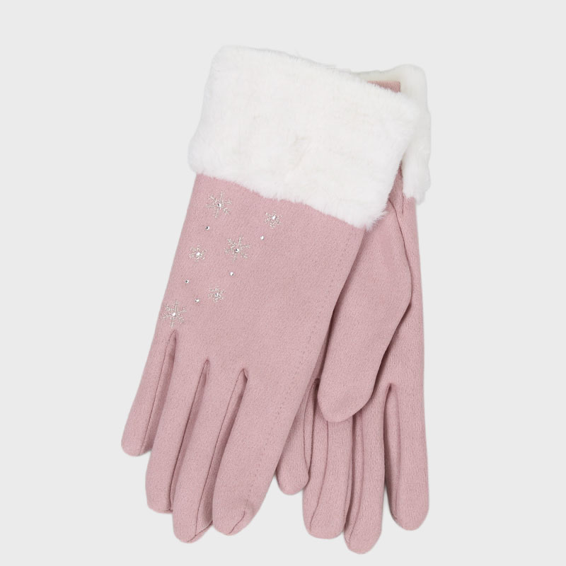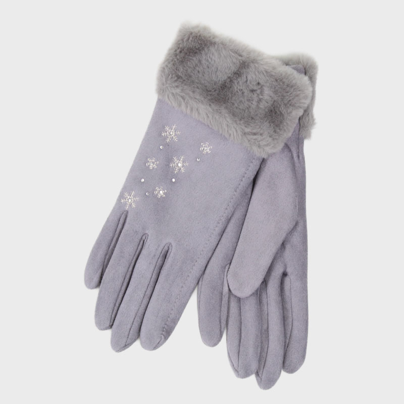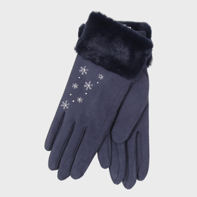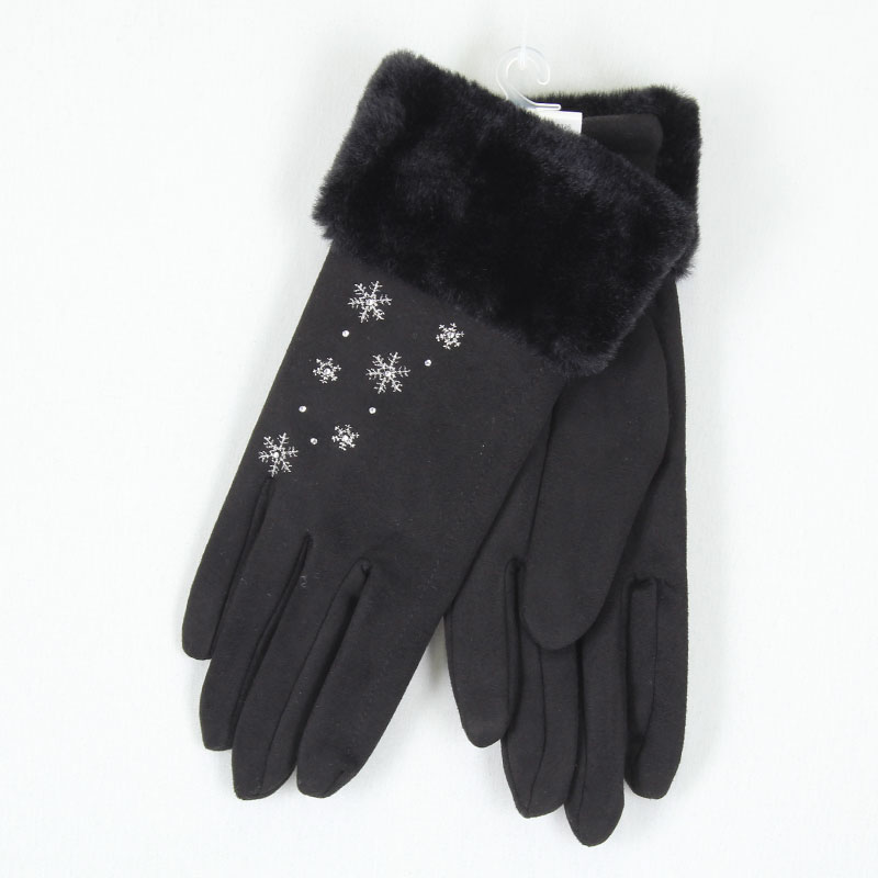 婦人手袋 スエードタッチ『袖口エコファー 雪柄 ラインストーン付き』