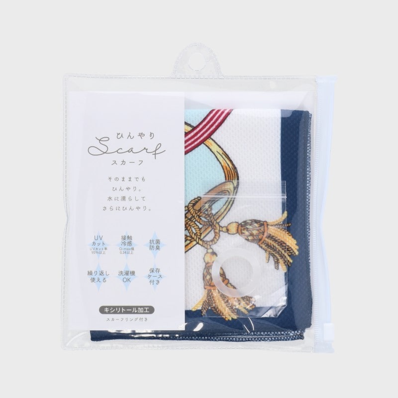 『ひんやりスカーフ』リング付きスクエアスカーフ(ベルトリボン柄)/ケース付き・UVカット・洗濯機OK