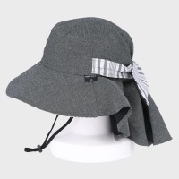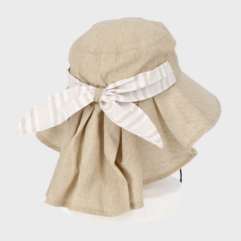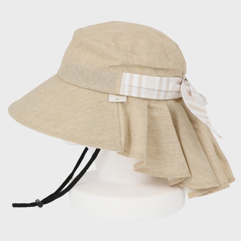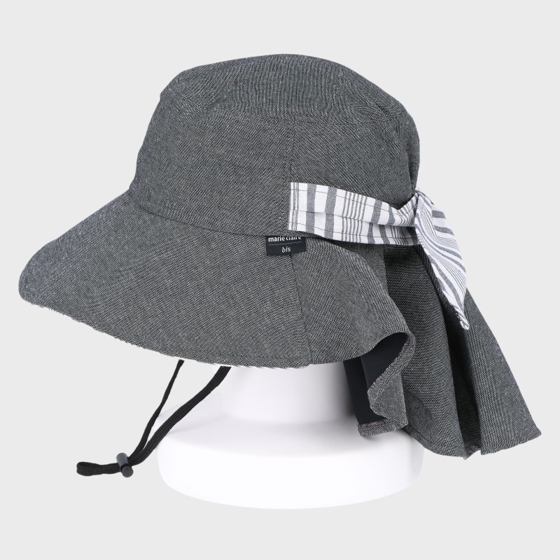 『marie claire/bis』タレ付きストライプ柄ギャザーハット/あご紐付き・UV90%カット・洗濯機洗い可能