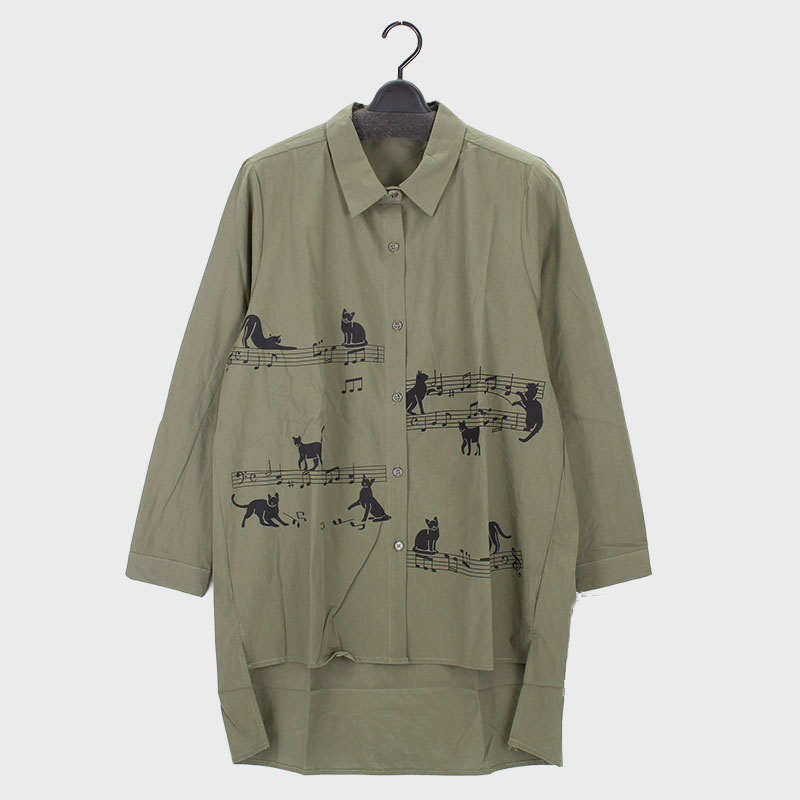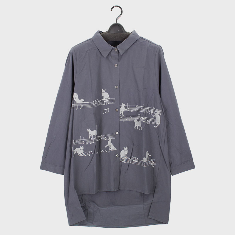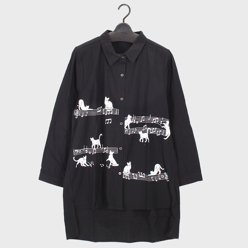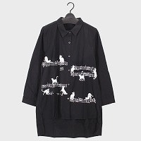 婦人長袖ネコプリントロング丈シャツ