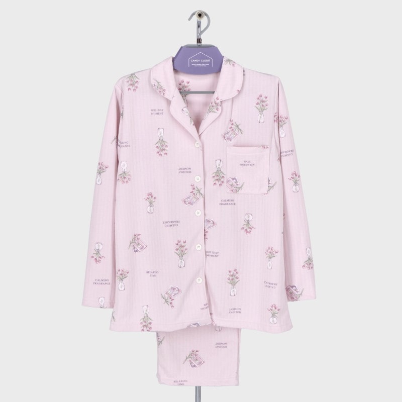 婦人『Candy Closet』ストライプキルト衿付き前開きパジャマ(チューリップ)