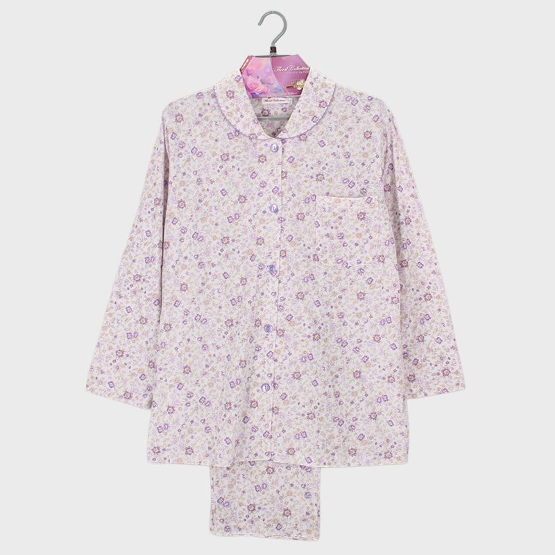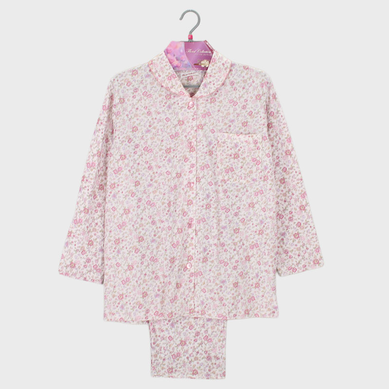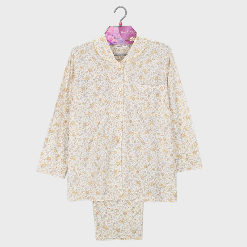 婦人綿100%天竺衿付き長袖パジャマ(花更紗)