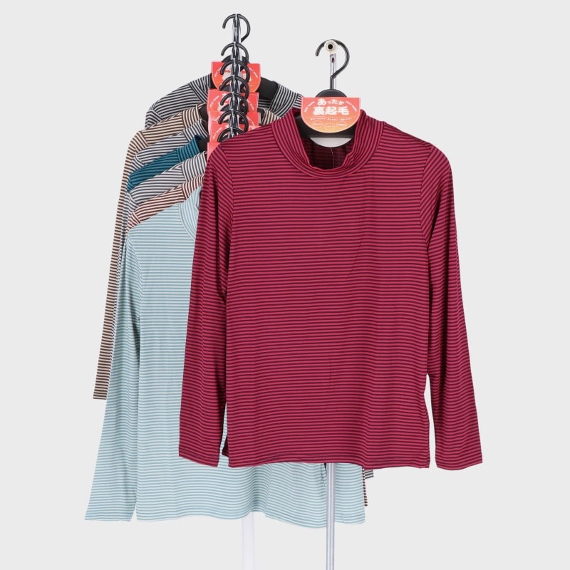 婦人ストレッチ裏起毛ボーダーハイネックTシャツ