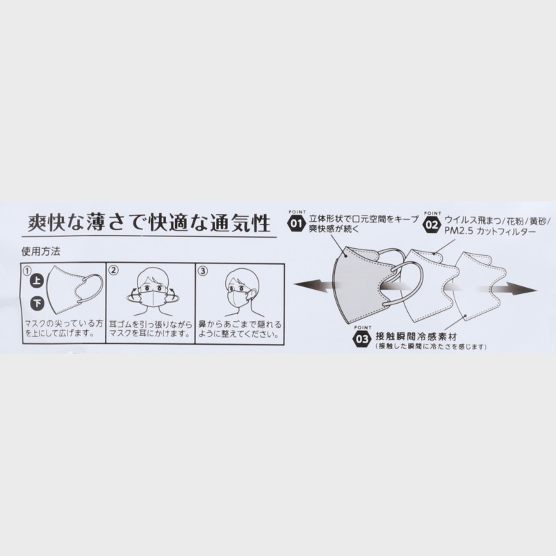 【素材】本体:ポリプロピレン・ポリエチレン(接触冷感不織布)/フィルター:ポリプロピレン/外気側:ポリプロピレン/耳部:ポリエステル・ポリウレタン