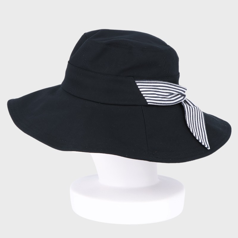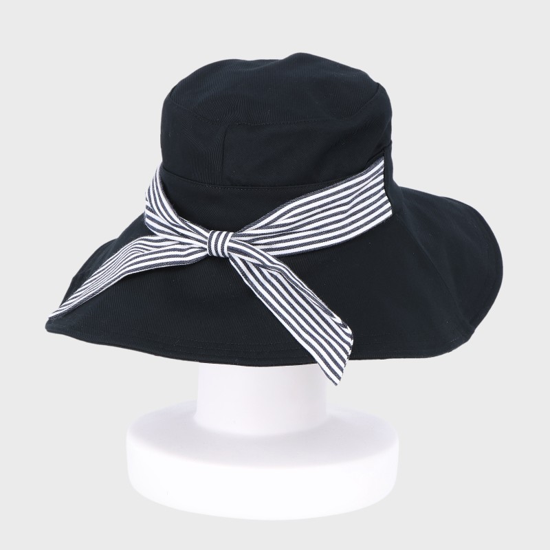 婦人『心も晴れるおでかけ帽子』つば先ワイヤー入りつば広ストライプリボンハット/UPF50+・あご紐ループ付