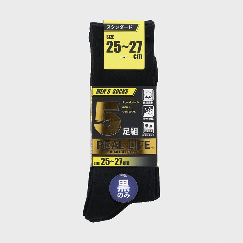 紳士綿混リブクルーソックス5足組(黒)25−27cm