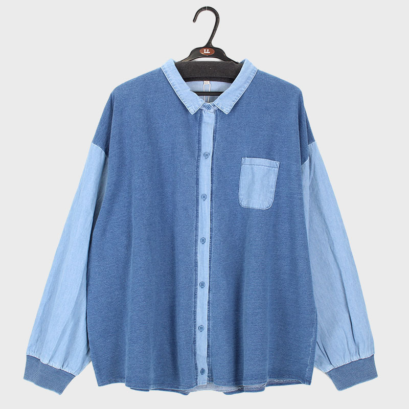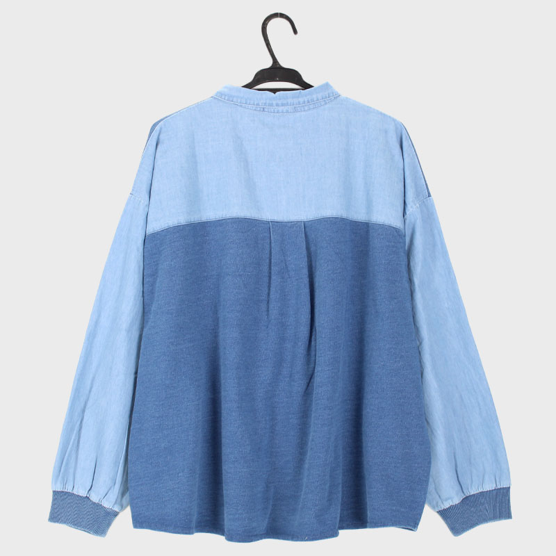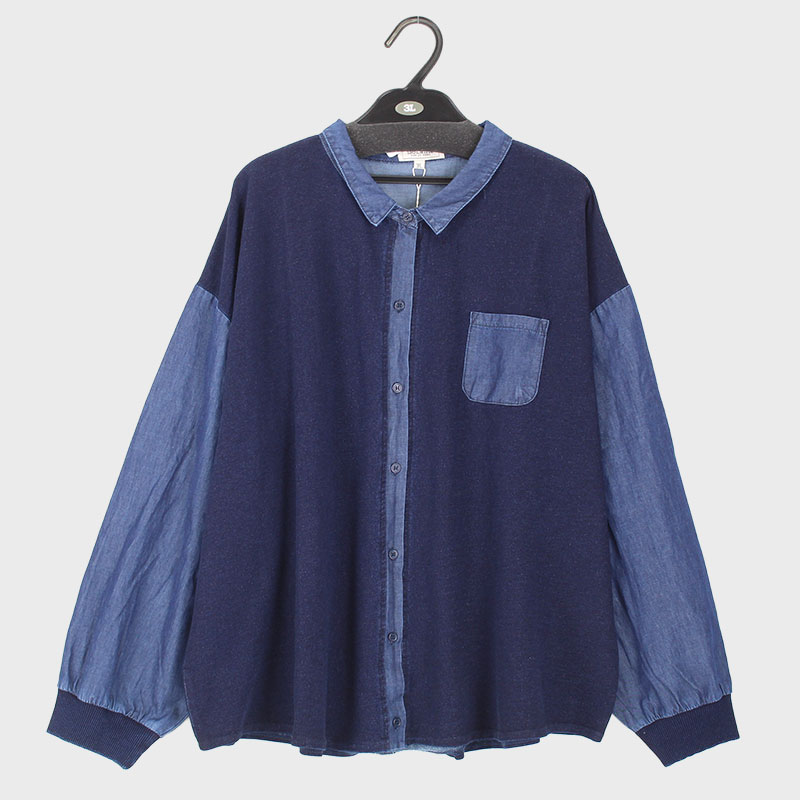 婦人大寸長袖インディゴ染めミニ裏毛デニム切替シャツ