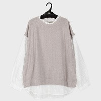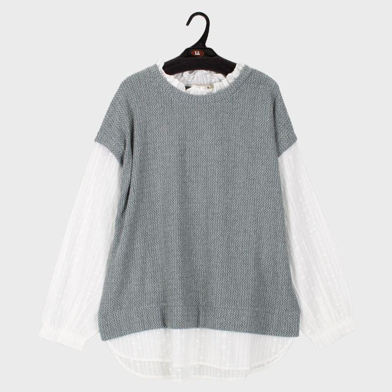 婦人大寸長袖ニットソーレイヤード風レース切替プルオーバー