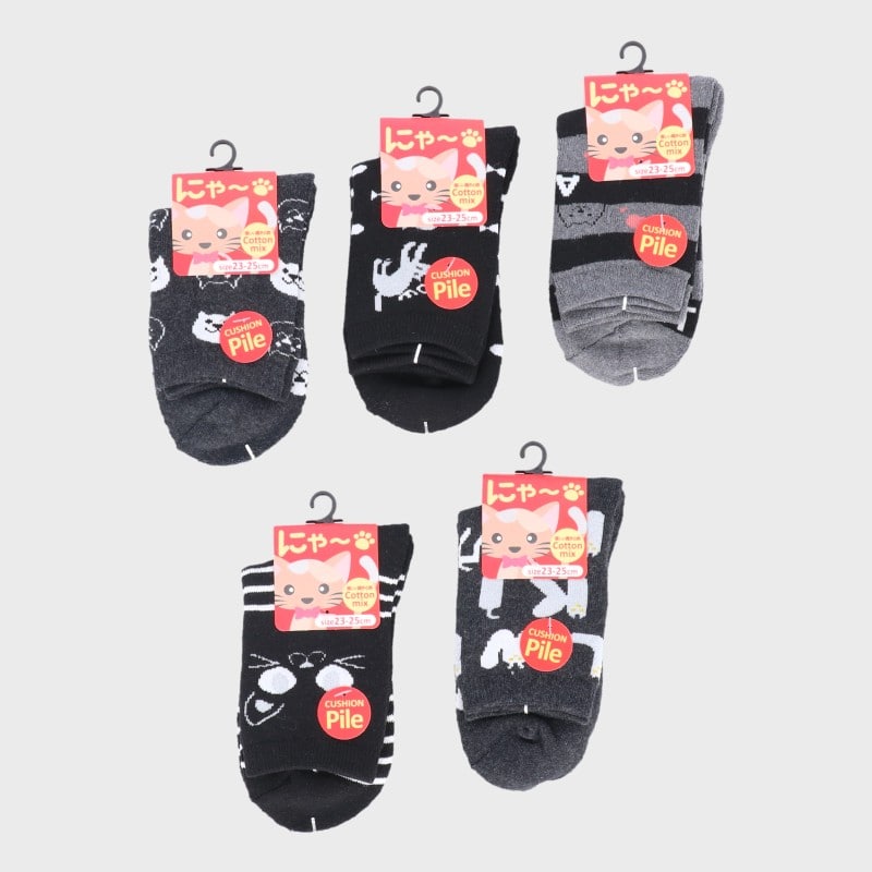 婦人綿混ネコ柄パイルソックス 5柄アソート