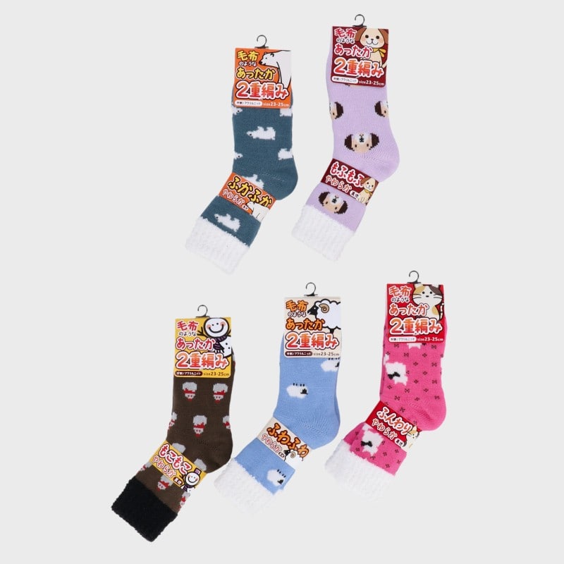 婦人ふわふわ二重編みソックス動物柄