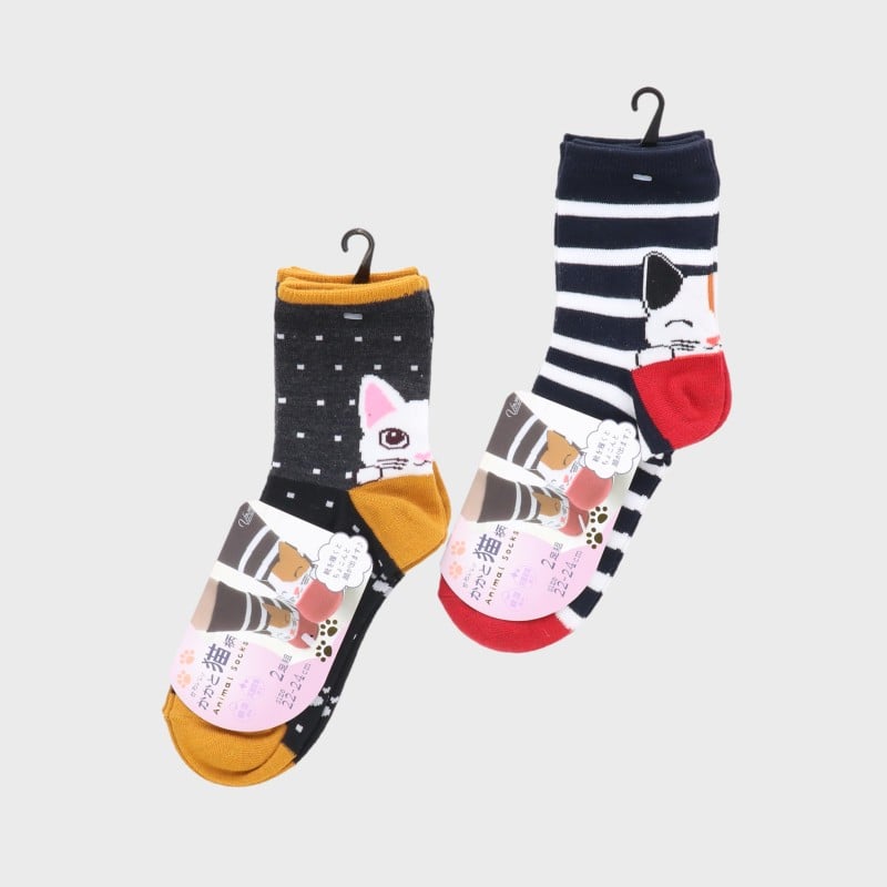 婦人クルー丈かかとネコ柄2足組