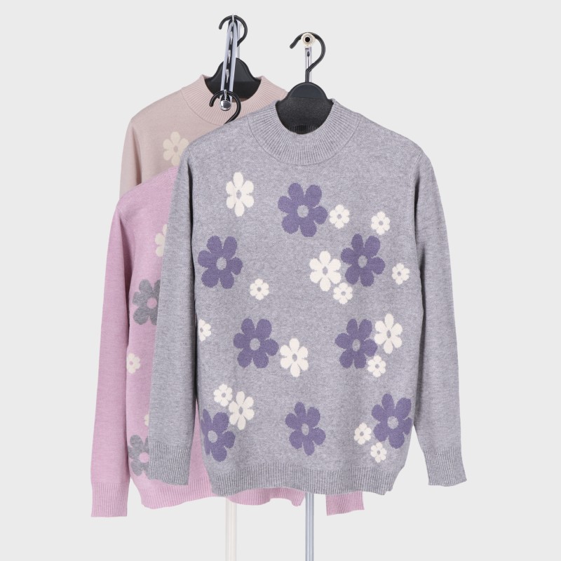 婦人大寸もちもちニット配色プルオーバー