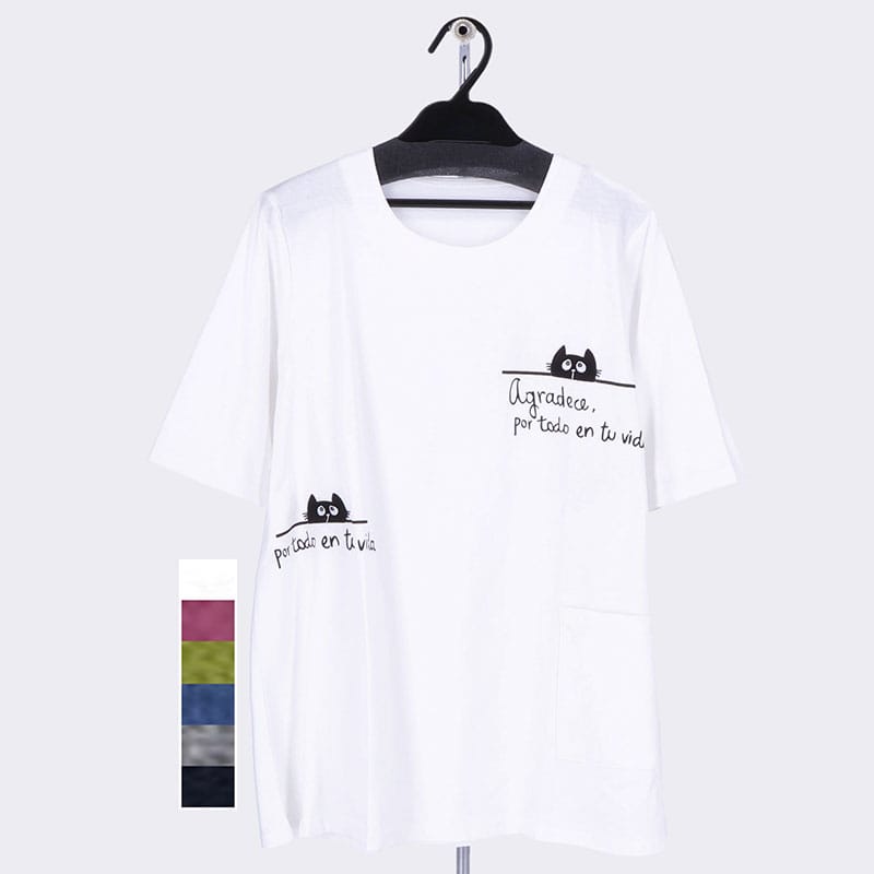 婦人ねこアップリケ刺しゅうポケット付きTシャツ