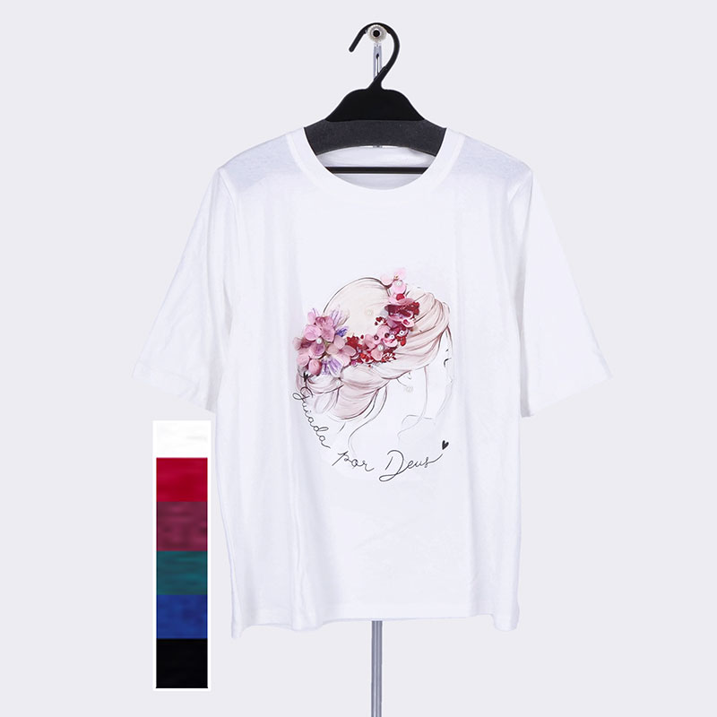 婦人半袖パール付きプリントTシャツ