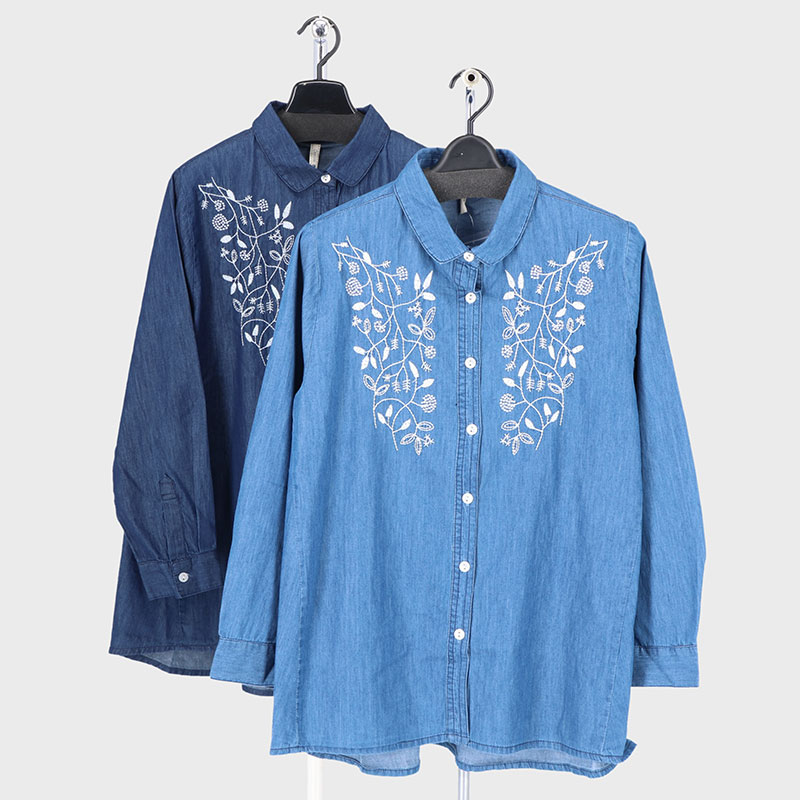 婦人長袖デニム刺しゅうシャツ