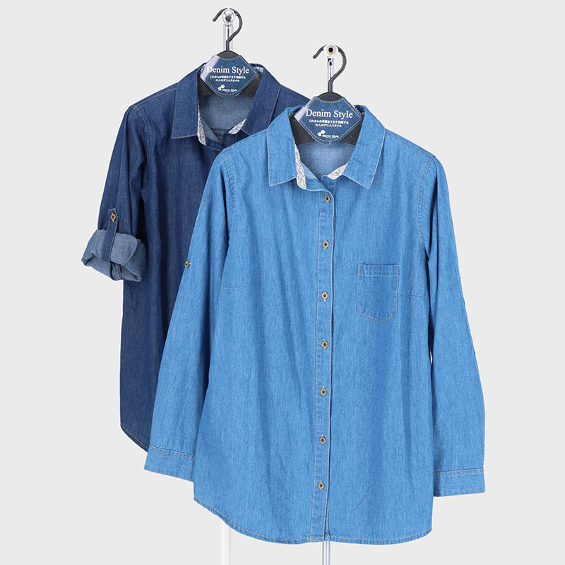 婦人デニム花柄プリントシャツ