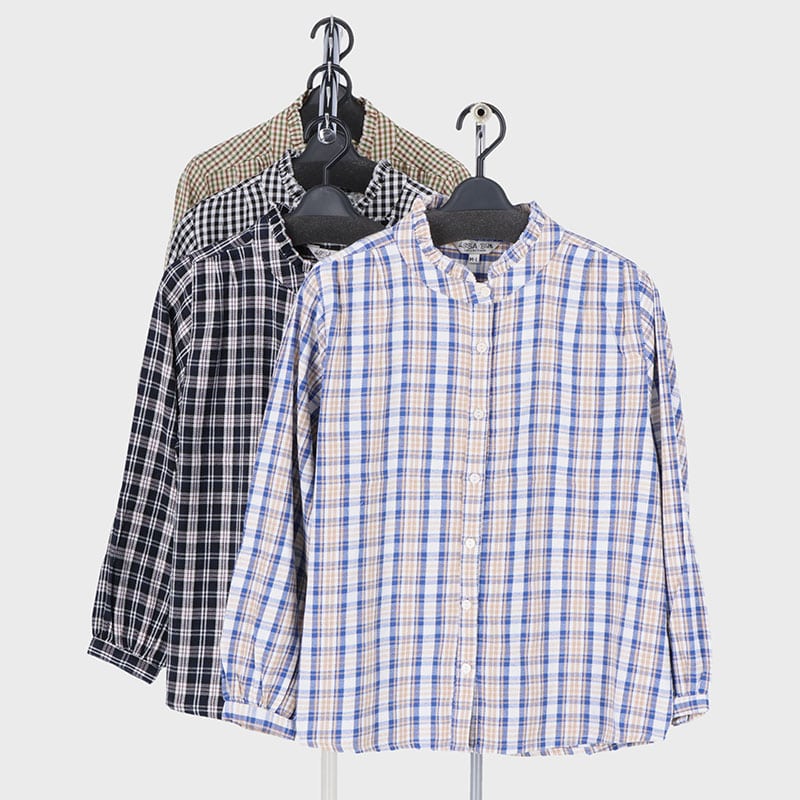 婦人格子柄フリル衿シャツ