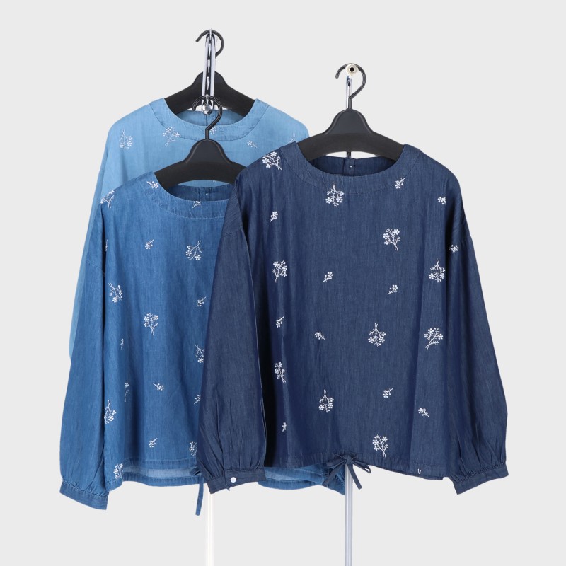婦人長袖デニム前身刺繍プルオーバー