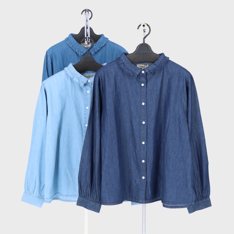 婦人長袖デニムフリル衿ブラウス