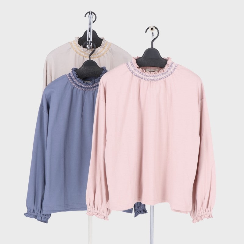 婦人長袖配色シャーリング衿プルオーバー