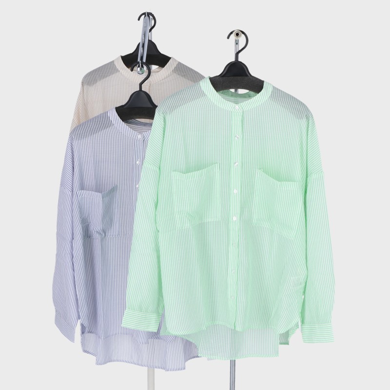 婦人長袖シアーストライプバンドカラーシャツ