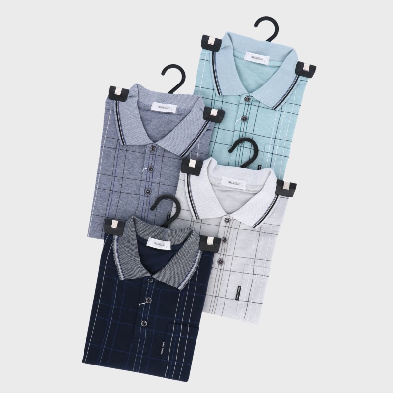 紳士長袖格子鹿の子ポロシャツ