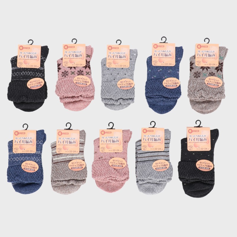 【バンドル】婦人『ゆったりあたたかパイル編み』パイナップル口ゴム超ゆったり柄クルー丈ソックス